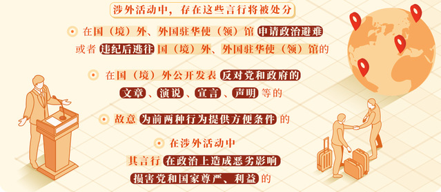4.在涉外活动中,其言行在政治上造成恶劣影响,损害党和国家尊严、利益的,给予撤销党内职务或者留党察看处分;情节严重的,给予开除党籍处分。此类违纪行为包括两个条件:一是该行为发生在涉外活动中;二是在政治上造成恶劣影响,损害党和国家尊严、利益。无论什么时候,党员干部都要切实增强政治敏锐性,在涉外活动中以良好精神风貌和举止言行维护党和国家形象,坚决防范有政治问题的言行。